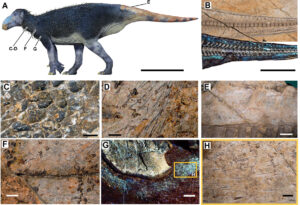 Structures visibles sur la peau d’Haolong : petites écailles tuberculeuses non chevauchantes le long du cou (C), petits piquants le long du cou (D), grandes écailles scutiformes non chevauchantes sur la queue (E), petites écailles tuberculeuses et piquants le long du sternum (F), les éléments bleu clair représentent de petites écailles tuberculeuses et de petites piquants (G). Photo en gros plan de G, avec de petites piquants bien conservés (H). Barre d’échelle : 50 cm (A), 25 cm (B), 1 mm (C,D,F,H), 2 cm (E), 1 cm (G) © Huang J. et al., Nature Ecology & Evolution