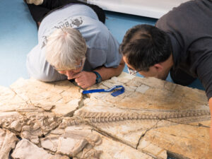 Pascal Godefroit (t-shirt bleu) examine le fossile © Thierry Hubin / Institut royal des Sciences naturelles de Belgique