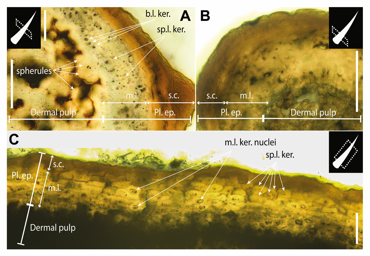 Coupe transversale des épines au microscope optique. Même les noyaux cellulaires des kératinocytes (cellules productrices de kératine) sont encore visibles. Barres d’échelle, 50 μm (a–c) © © Huang J. et al., Nature Ecology & Evolution