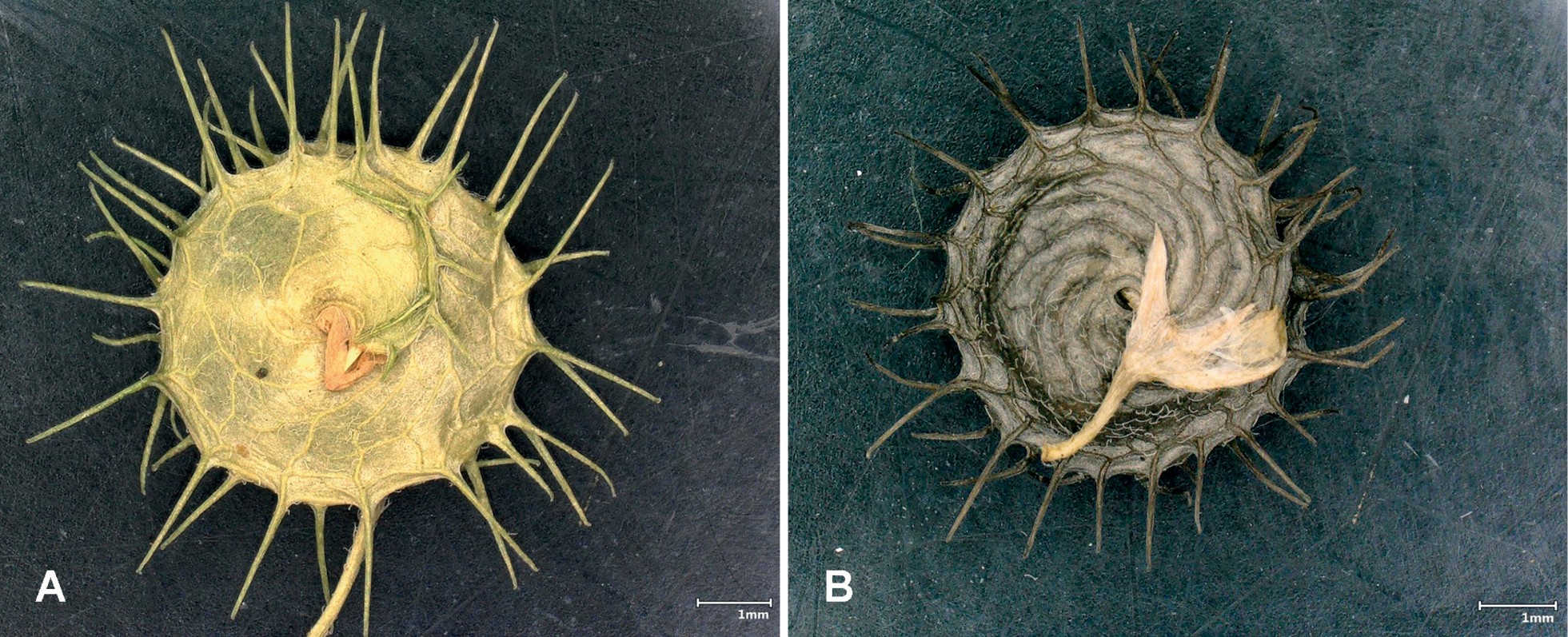 Jeune fruit (A) et fruit mature (B) de Medicago peregrina © Verloove et al.