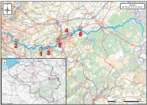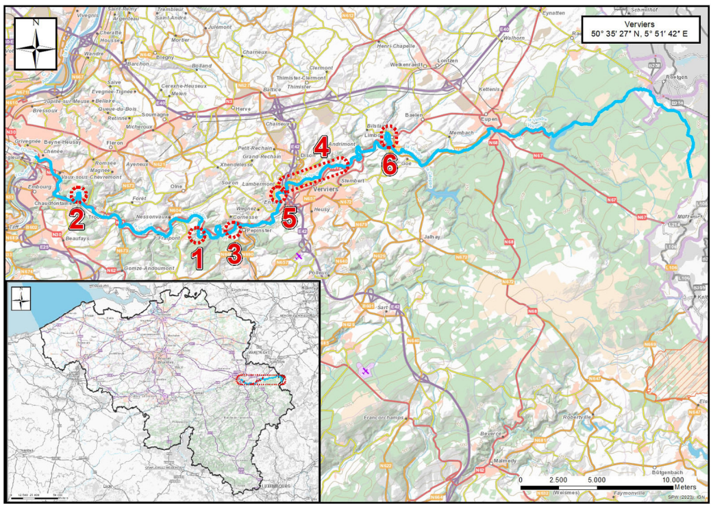 Localisation des endroits où les chercheurs ont trouvé le plus d’espèces exotiques: 1. Goffontaine, 2. Chaudfontaine, 3. Pepinster, 4. Verviers, 5. Ensival et 6. Dolhain © F. Verloove