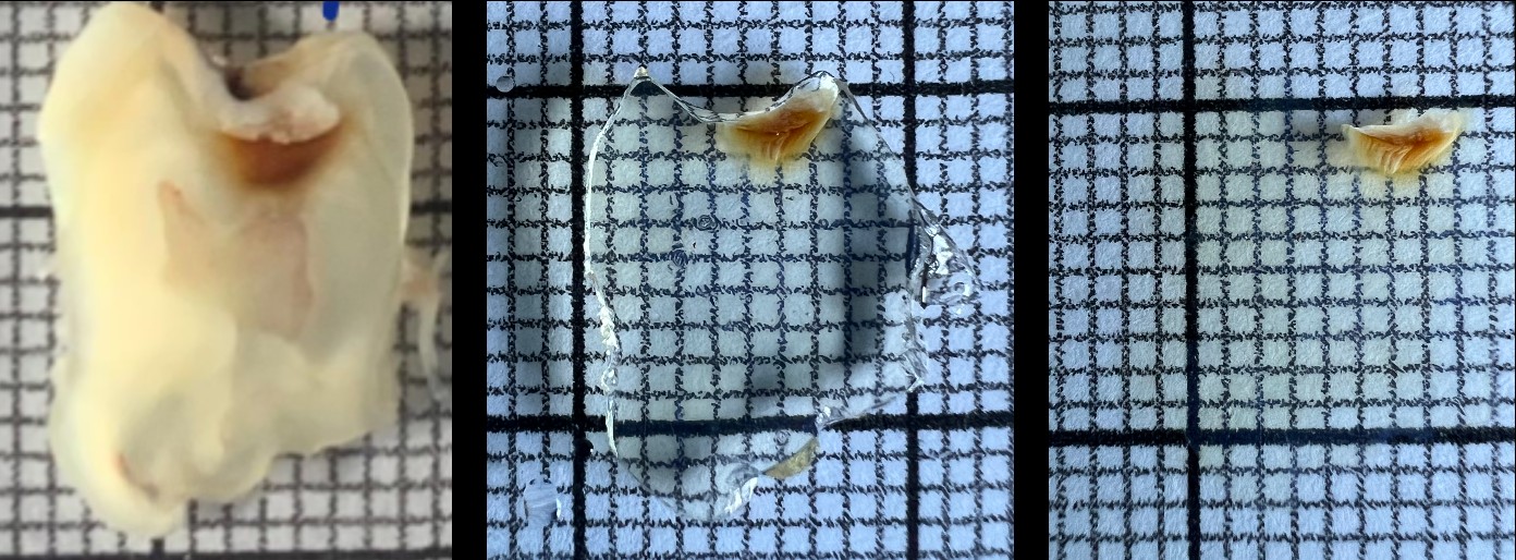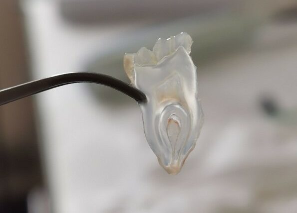 Coupe d’une dent rendue transparente grâce au protocole développé au laboratoire du professeur Baeyens. On peut voir que l’émail, la dentine et la pulpe sont intacts mais transparents, ce qui permet leur observation au microscope © Nicolas Baeyens