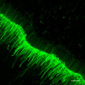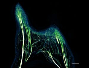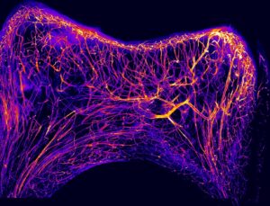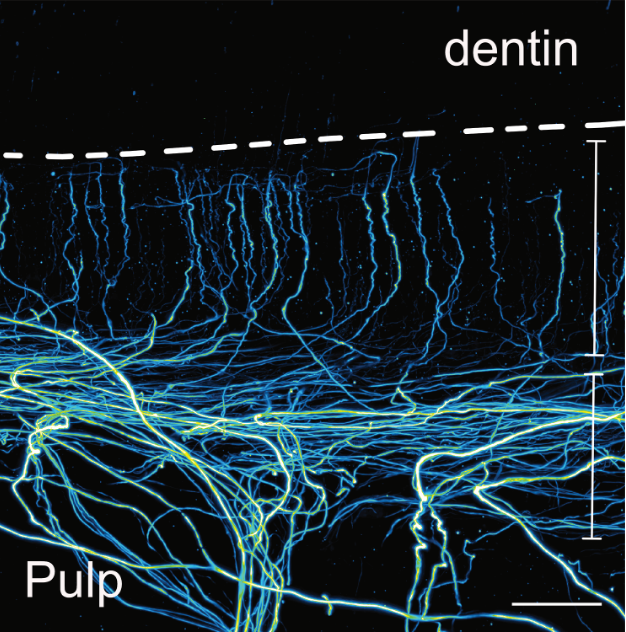 Gros plan sur les terminaisons nerveuses à l’interface entre la pulpe et la dentine. Cette dent, à un stade intermédiaire de carie, présente une densité très élevée de terminaisons, le résultat d’un processus de neurogenèse © Nicolas Baeyens