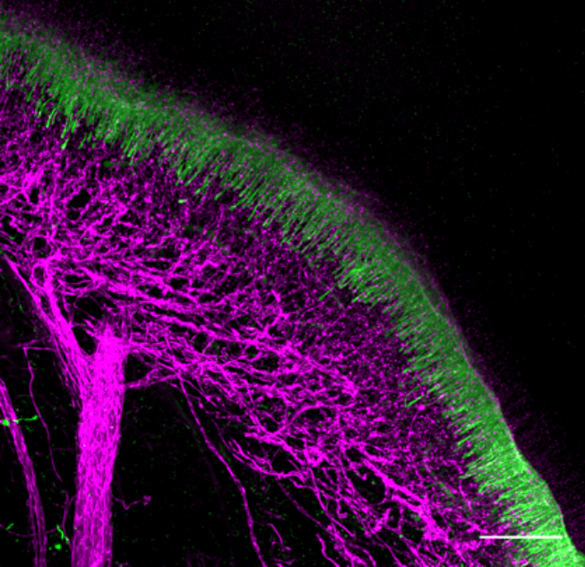 Nerfs de la pulpe (magenta) avec les cellules odontoblastiques (vert), responsables de la maintenance de la dentine © Nicolas Baeyens