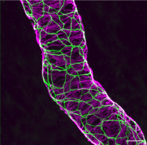 Gros plan sur une veinule de la pulpe dentaire. En vert, on voit les jonctions des cellules endothéliales; en magenta, les cellules musculaires lisses entourant le vaisseau © Nicolas Baeyens