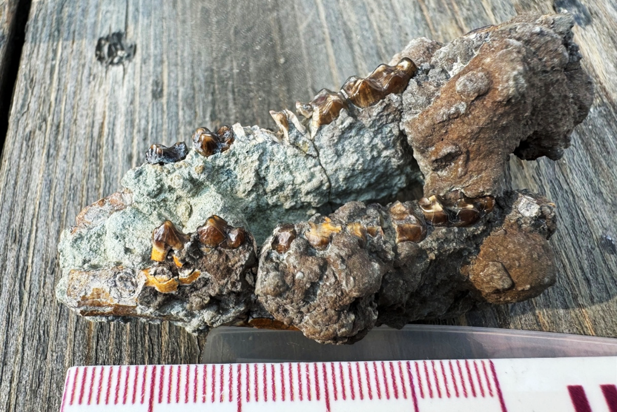 Petite mâchoire inférieure d’« Arenahippus » (barre d’échelle = 5 cm), considérée comme l’un des plus anciens chevaux connus, récemment découverte par Jérémy Tissier et Thierry Smith lors d’une expédition dans le Wyoming (États-Unis) en 2024. La nouvelle étude publiée dans PNAS révèle qu’il n’est pas étroitement apparenté aux chevaux, mais qu’il s’agit d’un cousin de tous les périssodactyles, y compris les rhinocéros, les tapirs et les chevaux © Annelise Folie