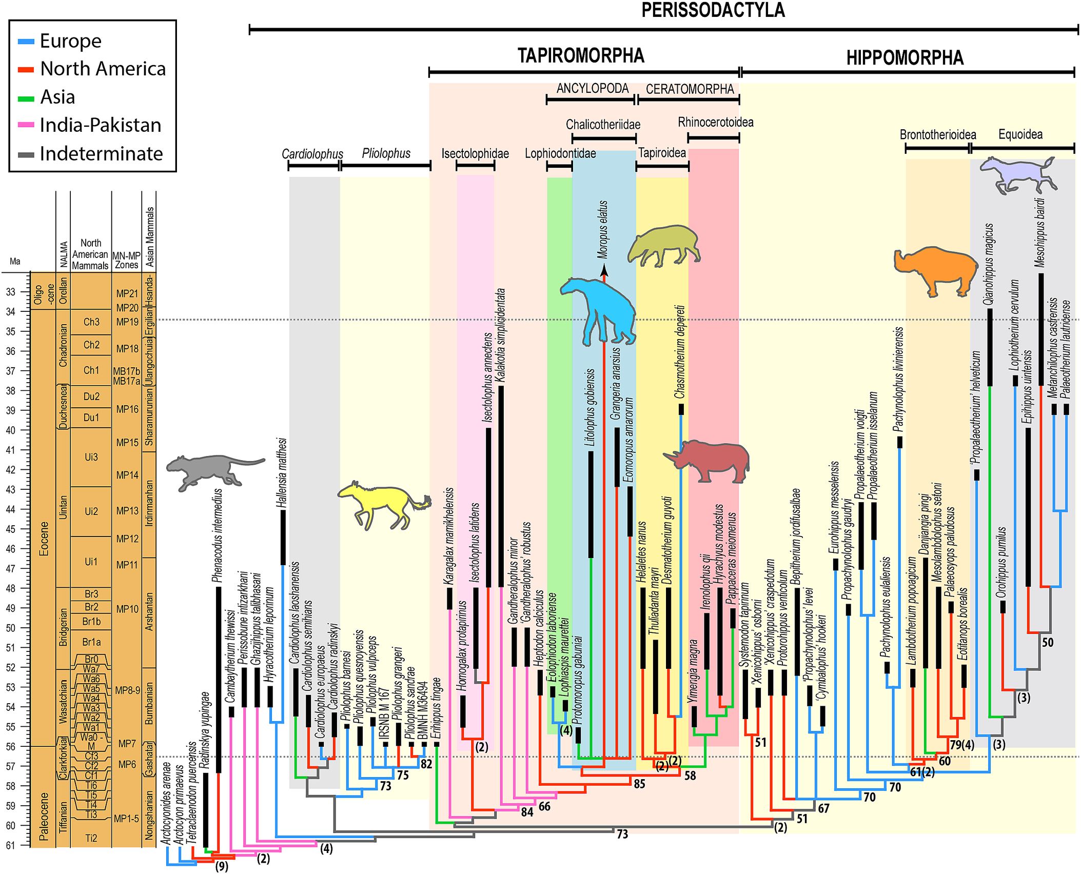 Le nouvel arbre évolutif des périssodactyles, proposé par Pr Thierry Smith et Dr Jérémy Tissier. Cet arbre montre que les chevaux (Equoidea ; case et animal en mauve à droite) sont un groupe dérivé de périssodactyles, apparu plus récemment qu’on ne le pensait auparavant (sur l’axe vertical, à gauche, on trouve le temps exprimé en millions d’années (Ma)). Hyracotherium ainsi que d’autres espèces qui lui sont apparentées, se trouvent maintenant à la base même de tous les périssodactyles (y compris les rhinocéros, les tapirs et les chevaux) © PNAS