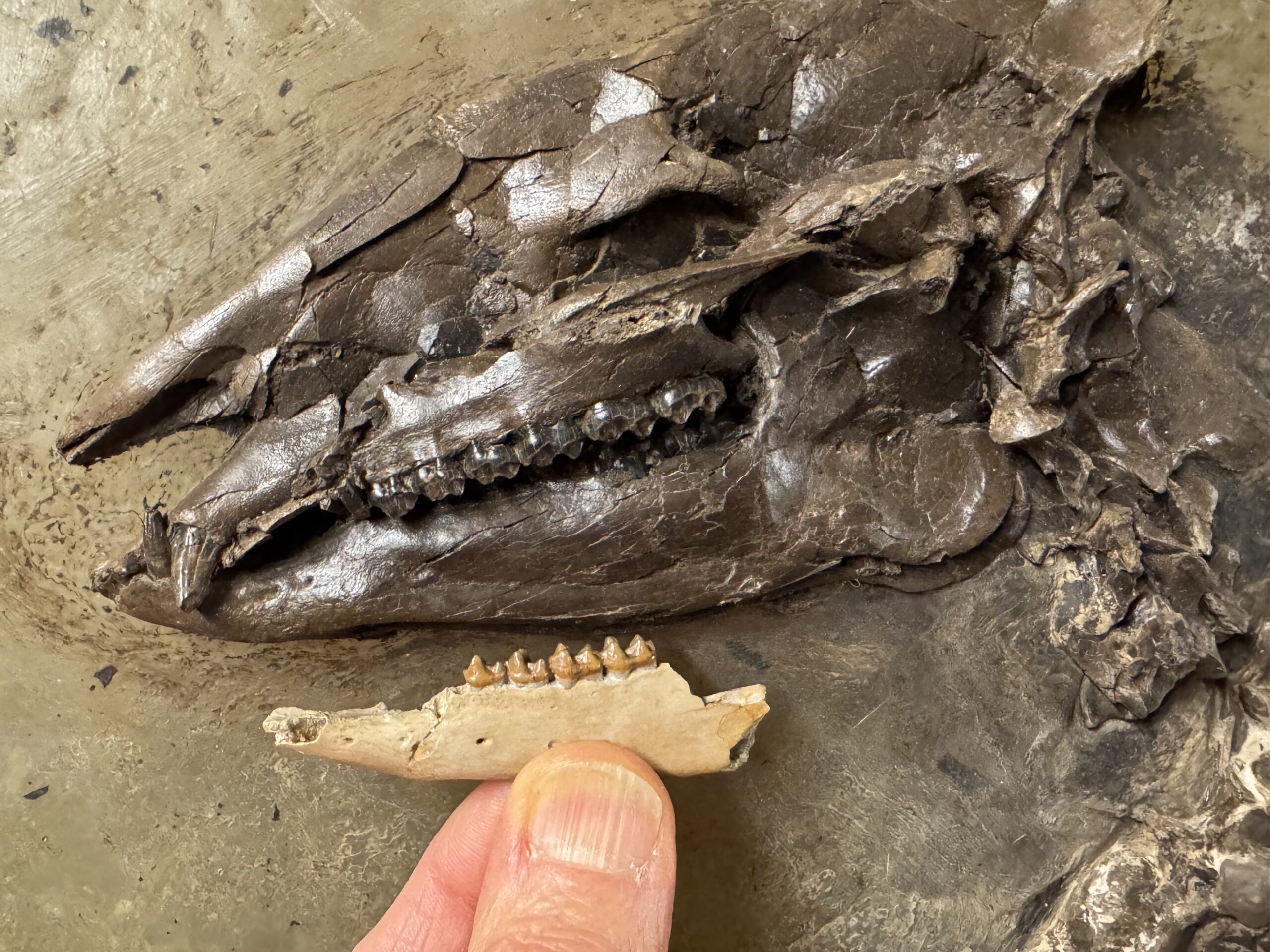 Mâchoire inférieure de Pliolophus quesnoyensis, un des plus anciens périssodactyles des collections de l’Institut des Sciences naturelles. A côté d’un crâne d’Eurohippus de Messel (Allemagne), conservé à l’Institut © Thierry Smith