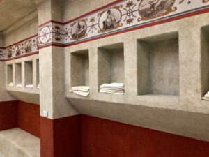 « Retour à Pompeii » nous fait découvrir une place publique, une rue bordée d’une école, d’une laverie, d’une boulangerie, d’un thermopolium (une sorte de snack-bar) ou encore le vestiaire des thermes. Celui-ci semble anodin, avec ses niches creusées dans les murs, où les visiteurs déposaient leurs affaires. Toutefois, ces lieux d’hygiène mais aussi de convivialité et de brassage social constituaient un monument essentiel des cités romaines.