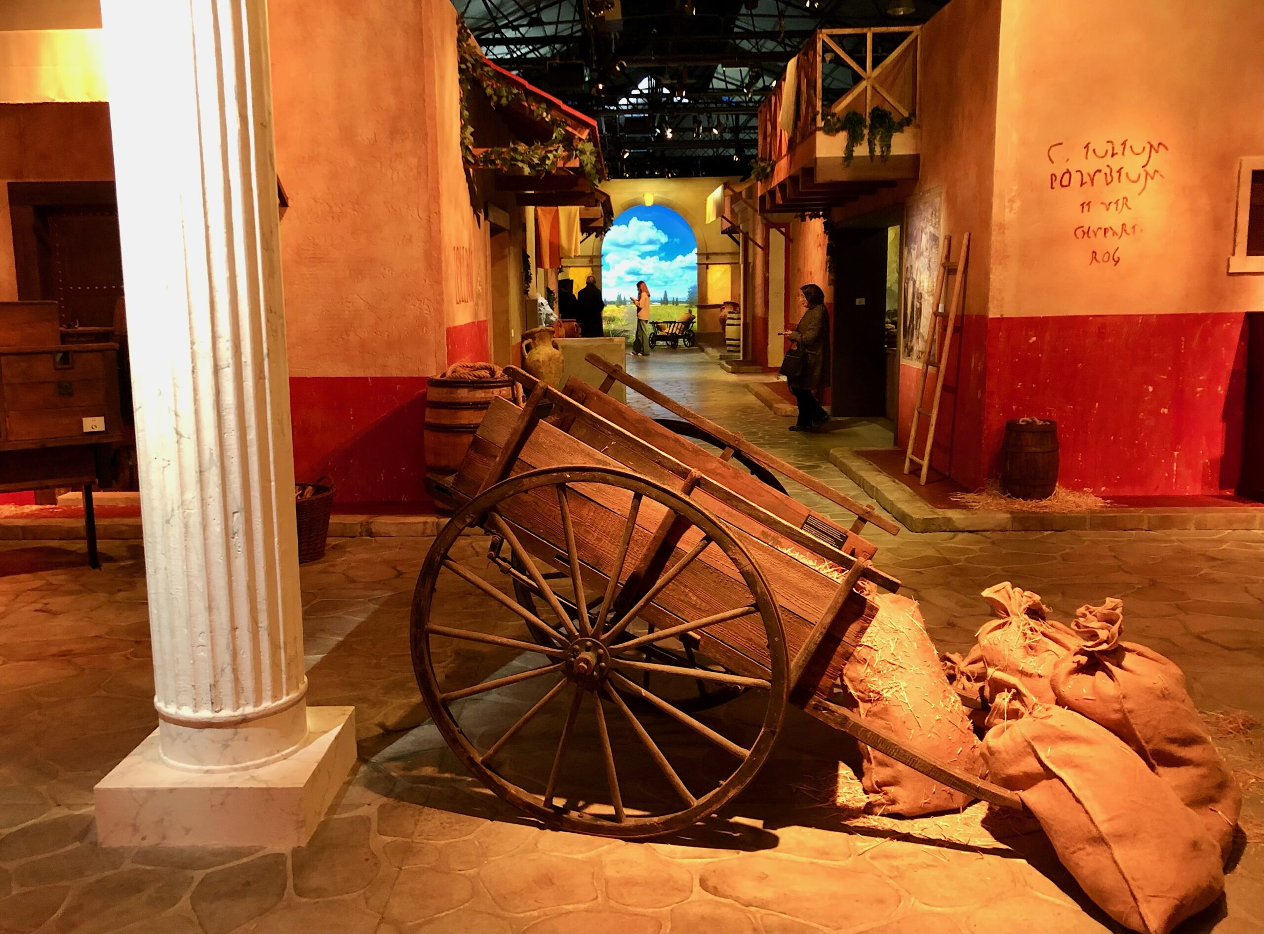 Après la maison de Cuspia, la visite s’ouvre sur une rue reconstituée de l’antique cité. C’est un voyage dans le temps et dans l’espace. « Tout ici est fidèle à la réalité », souligne Henri Dupuis, qui a développé l’exposition. « Mais ce n’est pas la réalité. Toutefois, chaque élément représente un objet ou un lieu tels qu’ils étaient à l’époque ».